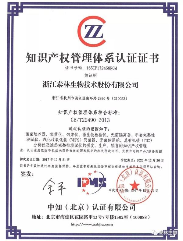 泰林生物喜獲知識產權管理體系認證證書